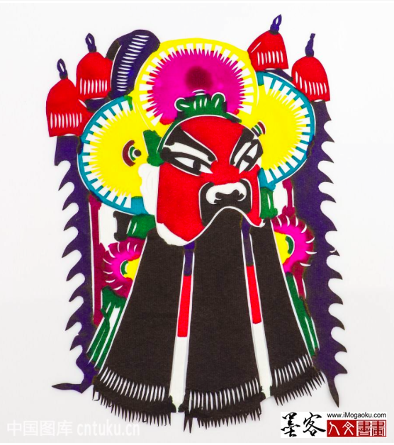 画出下垂的鬓角,其子铫刚的眼角却呈上翘之势,加上夸大的光嘴巴,一看便是血气方刚;再如关羽“面如重枣”,自然画红脸,包拯“铁面无私”则黑脸非他莫属,曹操“面带奸诈”便是一幅奸白脸。可见花脸脸谱是以色定调,如红色表示忠诚耿直、热情吉祥;黑脸表示豪爽粗暴、刚正不阿;紫色表示老实忠厚;黄色表示凶狠勇猛;蓝色表示桀傲不训、刚强爽快;白色表示奸诈多疑;绿色表示骁勇鲁莽;粉红色表示年迈血衰;金银色表示庄严,多用于神仙圣人。如果从这些画法来分析,就会看出门道来了。