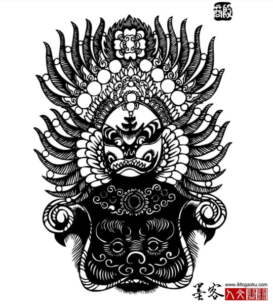 白虎(白色象形脸),《闹天宫》中天宫星宿,是西方武神。曾与众天神一道捉拿孙悟空。民间把白虎(西方)与朱雀(南方)、玄武(北方)、青龙(东方)并称四方之神。白虎为凶神、恶相。脑门绘“王”字纹,表示其为兽中之王。翻鼻孔,虎须,虎牙。