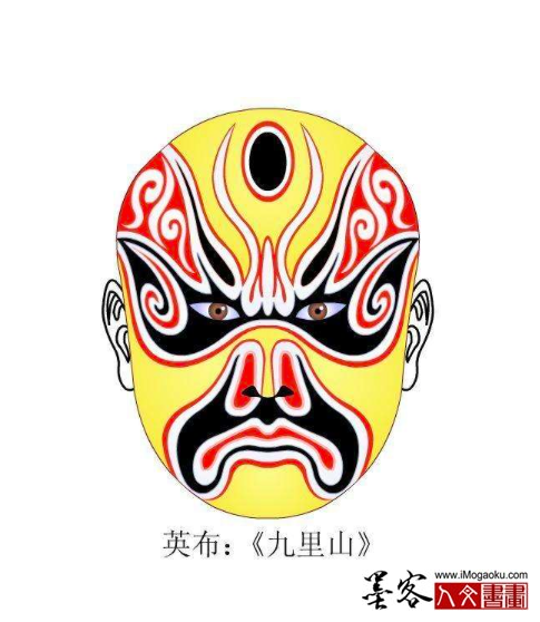 六分脸特点是将脑门的主色缩为一个色条,夸大眉形,白眉形占十分之四,主色占十分之六。“六分脸”也称“老脸”。