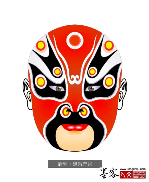 赵公明面画金钱,表示自己是财神爷。孙悟空(猴脸),《闹天宫》中人物。有火眼金晴,能七十二变化。因偷仙桃、闹天宫,玉皇大帝派天兵神将捉拿,未成。后被如来佛压在五行山下。故事见《西游记》第五回。孙悟空是神猴,顽皮、机智,故用猴脸。火眼金睛,眼圈用金色或黄色。额头上有佛珠。