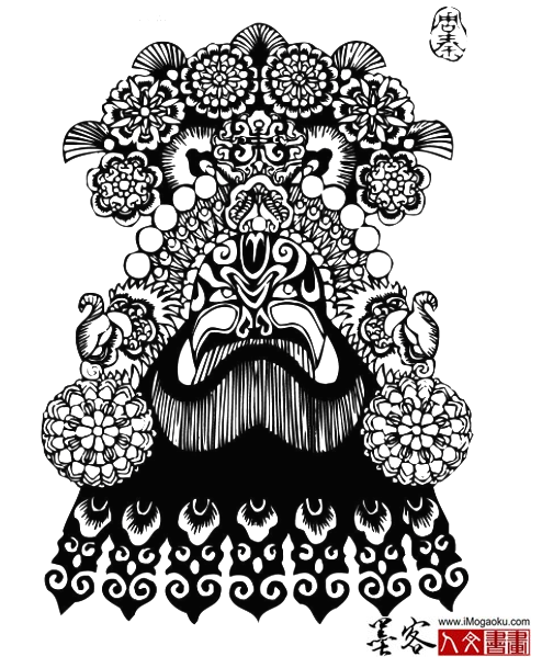 白虎(白色象形脸),《闹天宫》中天宫星宿,是西方武神。曾与众天神一道捉拿孙悟空。民间把白虎(西方)与朱雀(南方)、玄武(北方)、青龙(东方)并称四方之神。白虎为凶神、恶相。脑门绘“王”字纹,表示其为兽中之王。翻鼻孔,虎须,虎牙。