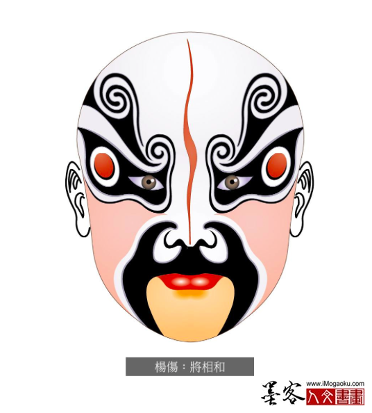六分脸特点是将脑门的主色缩为一个色条,夸大眉形,白眉形占十分之四,主色占十分之六。“六分脸”也称“老脸”。