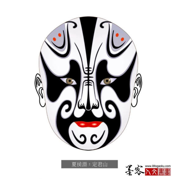 夏侯渊(花十字门脸),《定军山》中人物,曹操手下大将。张郃攻打葭萌关不利,败走定军山,投奔夏侯渊。黄忠等奉命追击,用计故意射杀夏侯渊之侄夏侯尚,将夏侯渊激怒,并趁机将其刀劈。夏侯渊原勾黑膛破脸,钱金福先生认为破脸有损大将威风,便创此谱式。通天纹勾长“寿”字,显得鼻梁突起,可使人物形象更雄壮。