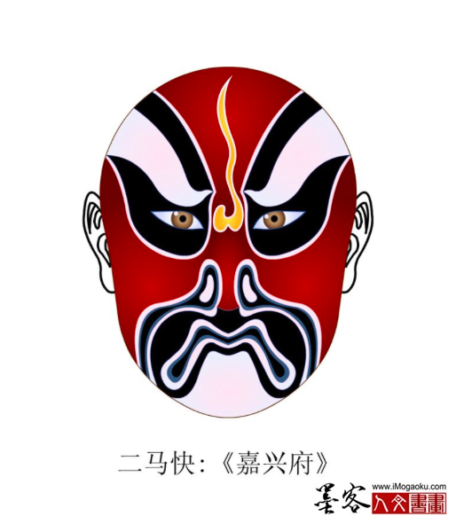 六分脸特点是将脑门的主色缩为一个色条,夸大眉形,白眉形占十分之四,主色占十分之六。“六分脸”也称“老脸”。