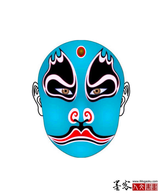一种颜色为主色, 以夸张肤色,再勾画出眉、眼、鼻、口和细致的面部肌肉纹细。