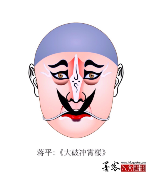 六分脸特点是将脑门的主色缩为一个色条,夸大眉形,白眉形占十分之四,主色占十分之六。“六分脸”也称“老脸”。