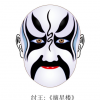 项羽(钢叉无双脸),《霸王别姬》中人物。楚汉相争,楚王项羽被困垓下,四面楚歌,哀叹大势已去。爱妃虞姬舞剑为项羽消愁后自刎。项羽悲伤之极,突围至乌江,无颜见江东父老,在乌江边自刎。他的脸谱既带有哭相,又表现出超凡脱俗的伟力与气质,对这位末路英雄的神情刻画的淋漓尽致。双眉为寿字眉。