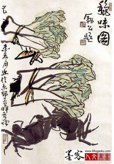 1975年,作《白菜江蟹图》,以白菜自喻,以江蟹讽喻“四人帮”。