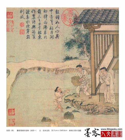 王蒙 《葛稚川移居图》 葛稚川,名洪,自号抱朴子,东晋时人,著有《抱朴子》、《神仙传》等书传世。此图画葛洪携子侄徙家于罗浮山炼丹的故事。画卷取全景式构图,但又不像宋画那样突出一主峰,而是强调众多山形所造成的一种整体气势和气氛。除画面左角空出一小块水面外,其余各处都布满了山石树木,使景致显得格外丰茂华滋,是王蒙典型的重山叠嶂式。