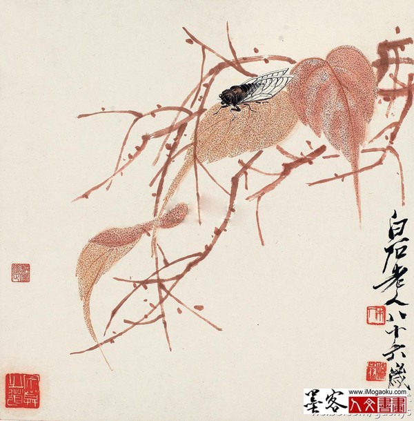 齐白石在绘画艺术上受陈师曾影响甚大,齐白石同时吸取吴昌硕之长。齐白石专长花鸟,笔酣墨饱,力健有锋。但画虫则一丝不苟,极为精细。齐白石还推崇徐渭、朱耷、石涛、金农。尤工虾蟹、蝉、蝶、鱼、鸟、水墨淋漓,洋溢着自然界生气勃勃的气息。山水构图奇异不落旧蹊,极富创造精神,篆刻独出手眼,书法卓然不群,蔚为大家。齐白石的画,反对不切实际的空想,齐白石经常注意花、鸟、虫、鱼的特点,揣摩它们的精神。齐白石曾说:为万虫写照,为百鸟张神,要自己画出自己的面目。齐白石的题句非常诙谐巧妙,齐白石画的两只小鸡争夺一条小虫,题曰;“齐白石日相呼”。一幅《棉花图》题曰:“花开天下暖,花落天下寒”。《不倒翁图》题“秋扇摇摇两面白,官袍楚楚通身黑。”