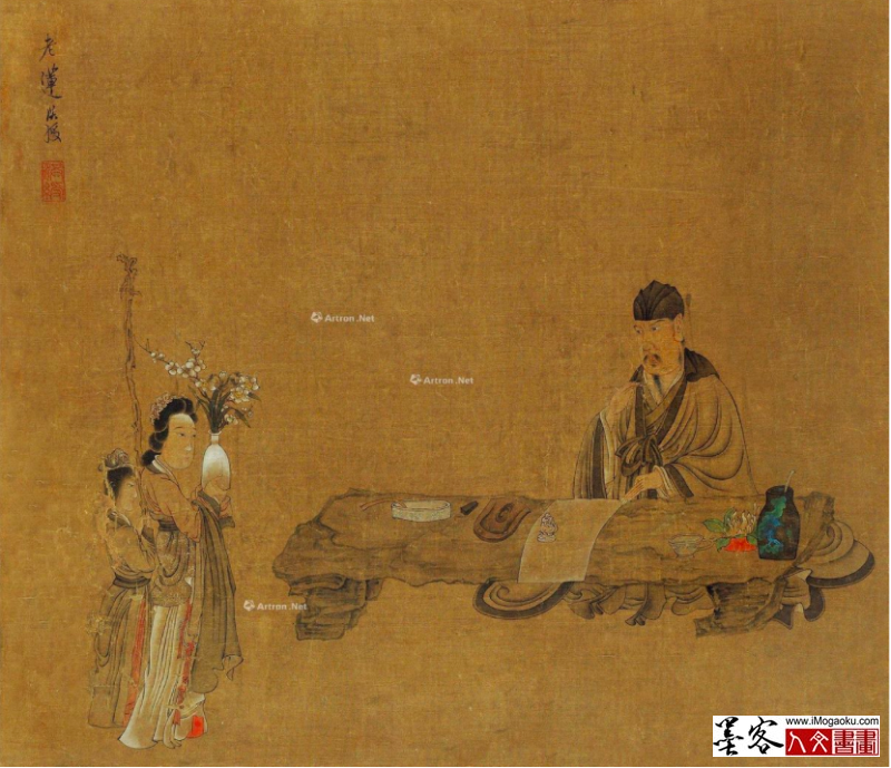 出了极高的绘画天赋。相传陈洪绶四岁时到已订亲的岳父家读书,见室内墙壁粉刷一新,便用桌椅做脚手架,在墙上画了一尊八九尺高的武圣关公像,像身拱手而立,栩栩如生,老丈人见了,吓得赶紧下拜,并且长期供奉(闻于翁,翁见矦像,惊下拜,遂以室奉矦)。九岁父亲去世,随蓝瑛(“浙派三大家”之一)学画花鸟。蓝瑛赞叹道:“使斯人画成,(吴)道子、(赵)子昂均当北面,吾辈尚敢措一笔乎!”自愧在人物写生上力不及洪绶,并从此立誓不再画人物,曰:“此天授也。”