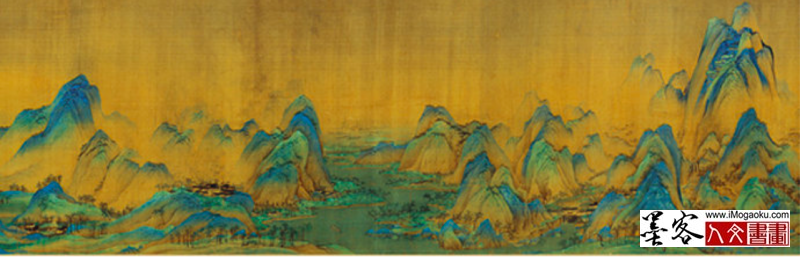 《千里江山图》纵51.5厘米,横1191.5厘米,绢本,青绿设色,无款,据卷后蔡京题跋知系宋代王希孟所作,现藏故宫博物院。