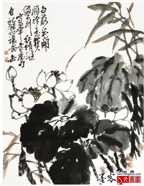画法,并博采徐渭、八大、石涛和扬州八怪诸家之长,兼用篆、隶、狂草笔意入画,色酣墨饱,雄健古拙,亦创新貌。其作品重整体,尚气势,认为“奔放处不离法度,精微处照顾气魄”,富有金石气。讲求用笔、施墨、敷彩、题款、钤印等的疏密轻重,配合得宜。
