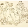 汤垕:吴道子笔法超妙,为百代画圣。早年行笔差细,中年行笔磊落挥霍,如蓴菜条。人物有八面,生意活动,方圆平正,高下曲直,折算停分,莫不如意。其傅彩于焦墨痕中,略施微染,自然超出缣素,世谓之吴装。(《画鉴》)