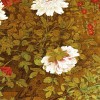 牡丹花常被称为富贵花。它是花中之王。自唐代以来,牡丹就成了民间所爱的、画家常写的花卉了。牡丹与白头翁 (鸟名 )画在一起,叫做“玉堂富贵”了。图中牡丹、玊兰、海棠杜鹃,布满全幅,最后还用石青衬地。枝叶花鸟,用墨笔钩出轮廓,然后敷以彩色,湖石下还绘了一只野禽。这种满纸点染,不留隙地的画法,显然受了佛教艺术的影响。五代时后,花鸟画盛行,徐熙、黄筌二人,一在南唐、一在后蜀,同为后世花鸟画之祖。黄筌一派的花鸟画,用重色,气象华贵,非常艳丽。