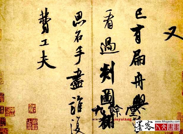 米芾书。极为豪放,笔力雄伟,神采奕奕。诚如宋赵秉文所盛赞的:“此 册最为豪放,偃然如枯松之卧涧壑,截然如快剑之斩蛟龙,奋然如龙蛇之 起陆,矫然如雕鹗之盘空,乌获之扛鼎,不足以比其雄且壮也,养由基之 贯七札,不足以比其沉着痛快也。”见此册,可以使人想象出米芾当时挥 毫时“神游八极,眼空四海”的惊人气魄。