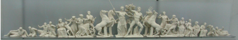 帕特农神庙正面山墙上的浮雕,大理石,高112厘米,公元前449年—前400年,现藏伦敦不列颠博物馆)