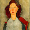 莫迪利亚尼所描绘的肖像有着统一的造型模式:如同面具似的面孔、不画眼珠的杏眼、三角形的鼻子、小嘴巴,弧形的一线眉等。这些部分全被配置在倾斜着的头部,一个单纯化了的鹅蛋形的面孔、细长的颈脖,削肩膀,都是以明确的线条勾画出来。在构图上拉长的头部和歪斜的身姿稍微偏离中心线,有时为了取得平衡,两只眼睛也大小形状不一。令人惊叹的是画家通过这种极单纯化和模式化的造型竟能生动地表现出不同人物的不同个性特征,同时强烈而鲜明地传达出画家自己多愁善感的心情。