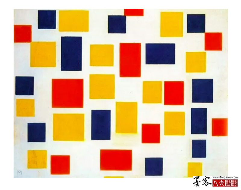 此后,他已完全不画眼睛看见的实物,而把绘画语言限制在最基本的因素:直线、直角、三原色(红、黄、蓝)和三非原色(白、灰、黑)上,称这种画为新造型主义。从1917年起,他画了大量这种作品,题目彼此差不多。《红、蓝、黄构图》也是如此,它作于1930年,有51厘米见方,现归纽约私人(MrandMrs,ArmandP,Bartos)收藏。