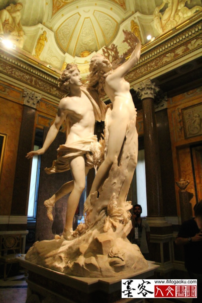 从《阿波罗与达芙娜》这一群像构图处理中,它充满了急速的运动感。而且表现了运动的过程,即追逐、逃跑和变形。它不是简单的动感造型,而是揭示了一种内部的矛盾运动。阿波罗已追上达芙娜,他的手已触及姑娘的身体,可是就在这瞬间里显示出他的努力变成徒劳无功,他的急速追赶变成枉费心机,她的逃跑也是无望的,她已开始变成月桂树了。