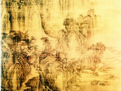 荆浩在这幅《匡庐图》中把后面的叠水以及水墨微妙的层次处理的很好避免了山中的瀑布因为线条的处理而显得生硬,画采用了水墨晕染的方法以及丰富的层次体现了山、水、树和景物之间的距离。
