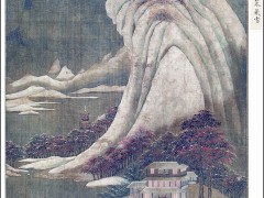 唐 杨升《蓬莱飞雪图页》。75x68cm,绢本设色,北京故宫博物院藏。杨升活跃于714年-743年,与张萱,杨宁同时任史馆画直。善长没骨山水,法张僧繇。元代著名书画家柯九思题诗一首:“仙山一夕遍琼瑶,万木森森长玉苗。处处楼台相掩映,素娥白鹤正逍遥。”