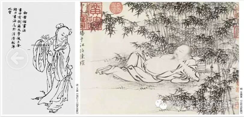 柳叶描 这种描法所画线条状如柳叶,而略短于兰叶描,轻盈灵动,婀娜多姿。《点石斋丛画》云:“ 笔下忌钉头怒降,心手相应而如柳叶。” 这种描法适宜于用来表现质地轻而软的衣服。如明代朱瞻基的《武侯高卧图》,人物的衣纹多用柳叶描,偶尔也用兰叶描画些较长的线,使整个画面呈现出一种清新、灵动、轻盈的美感。