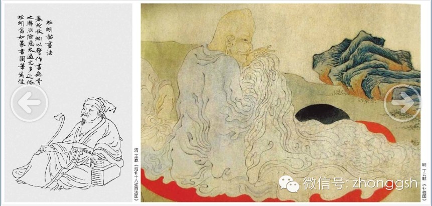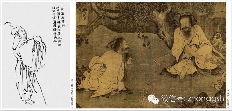枯柴描 枯柴描与减笔描在用笔上并无多大区别,只是前者渴笔较多,后者干湿并用。如宋代龚开的《中山出游图》,钟馗衣纹都用偏锋,渴笔画出,在线叉开时还会产生飞白的效果,一如枯柴高悬。明代画家多采用这种描法,如吴伟、张路、周臣等画中人物服饰中的线条基本上属于这一类型。