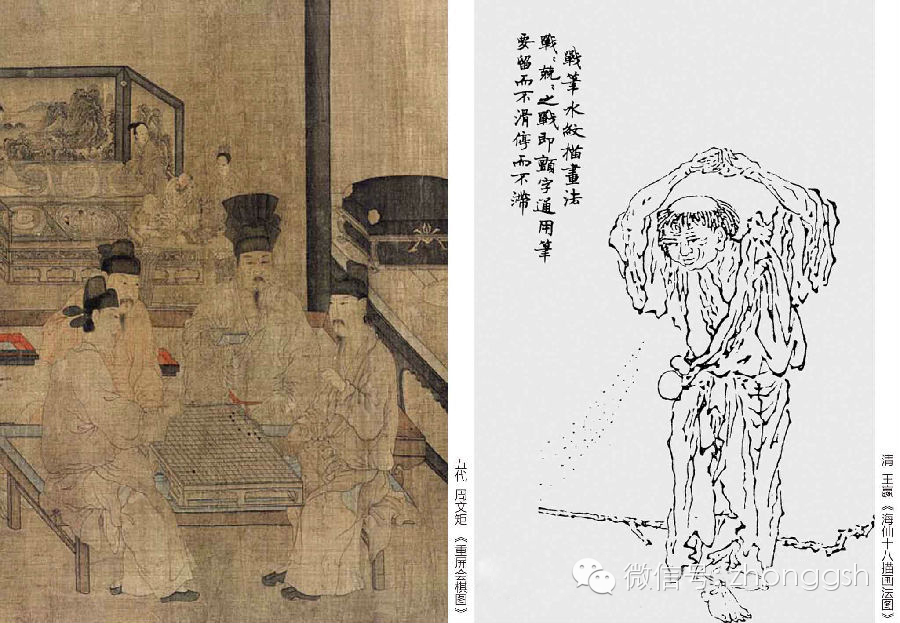 战笔描 又叫战笔水纹描,宋《宣和画谱》上有这样的记载:“ 周文矩,金陵句容人也,……善画,行笔瘦硬战掣。” 其中的 “ 瘦硬战掣 ” 一语,可视为战笔水纹描的原始依据。周文矩的《重屏会棋图》画当时文人士大夫弈棋聚会的情景,画中人物,笔法简细流利,衣纹线条呈现出曲折战颤之感,与画谱上的记载基本相符。