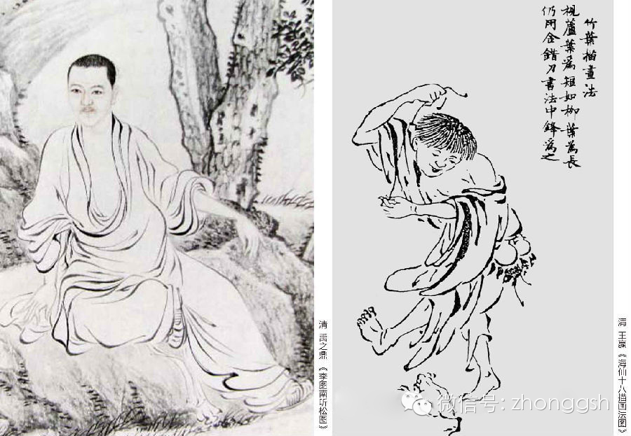 竹叶描 由宋时墨竹画技法演变而来,因线条状如竹叶而得名。《点石斋丛画》说竹叶描 “ 用笔横卧,为肥短撇捺,如竹叶。” 在人物衣纹的描法上,竹叶、柳叶、芦叶这三者叶子从外形上看都很相似,只有依靠描绘时手腕下笔的轻重、刚柔与长短等变化来加以区分。如清代禹之鼎所绘《李图南听松图》中的衣纹,用笔起伏顿挫明显,线条粗细变化较大,很像随风飘动的竹叶,飘逸活泼。