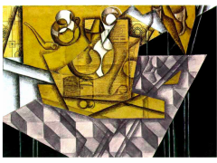 (3)1912-1914年的综合立体主义时期。从1912年到1914年他们进入了“综合立体主义”时期,这一时期,画家开始注重画面的整体效果,不再只是强调局部的分解。色彩渐渐丰富起来,事物的形态又重新被重视。