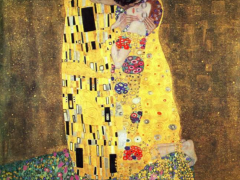 这是画家为比利时布鲁塞尔的斯托克莱宫绘制的壁画局部。这组壁画以彩色镶嵌的手法制作而成,具有十分浓郁的装饰性,并使用了金箔和银箔,使壁画显得十分富丽堂皇。画家以编织组合的图案和象征的手法,描绘出一对恋人拥抱在一起的情景,除了人物的头部鲜明外,整个人物形象被淹没在十分夺目的各式图案纹样之中。