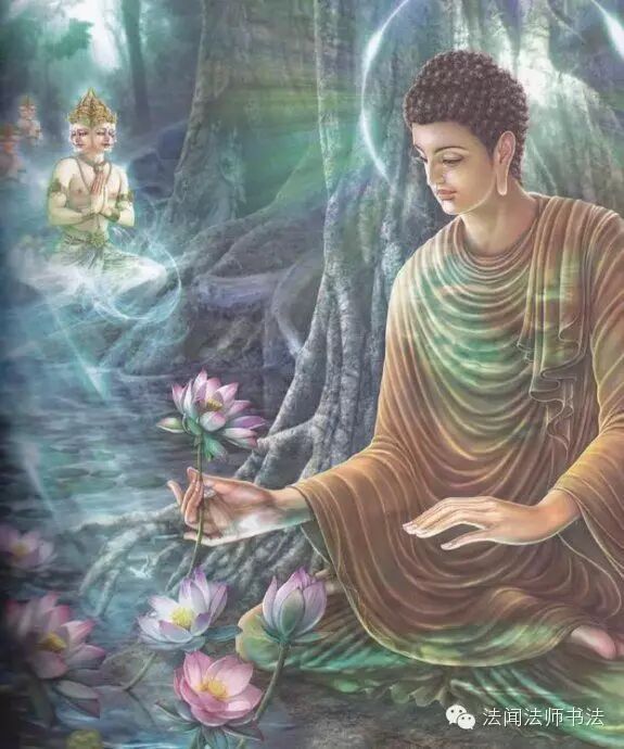 天主大梵天得知佛陀成就最正觉,特前来向佛陀献花,以此缘起恳请佛陀为众生宣说妙法,让一切众生成就佛陀一般伟大的生命品质。佛陀慈悲应允。