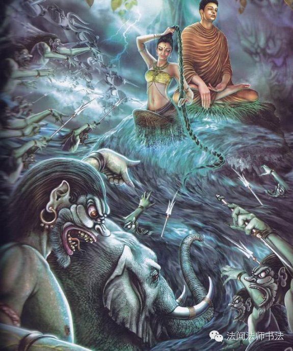 魔王见佛陀不为魔女所动,大为恼怒,派遣魔军前来妄图杀害佛陀。此时坚牢地神现身护持佛陀,水淹魔军。