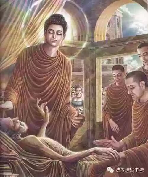 佛陀见到了病重的父王,并为他开示了三皈依法,父王因此得度。逝世后,佛陀尽职孝道,亲自抬父王的棺椁,为世人以身作则。