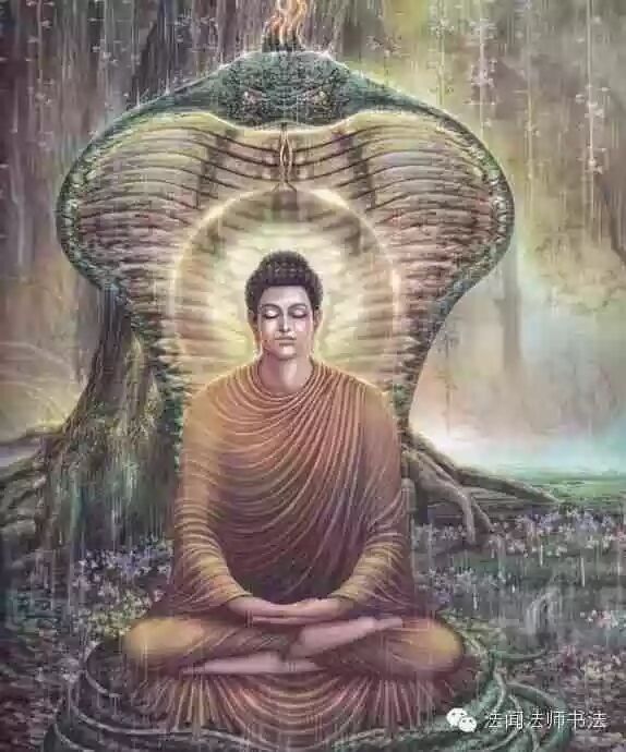 佛陀于菩提树下参悟,发誓不成正觉不离此座。当雨水下落天气寒冷时,龙王现身为佛陀遮风挡雨。
