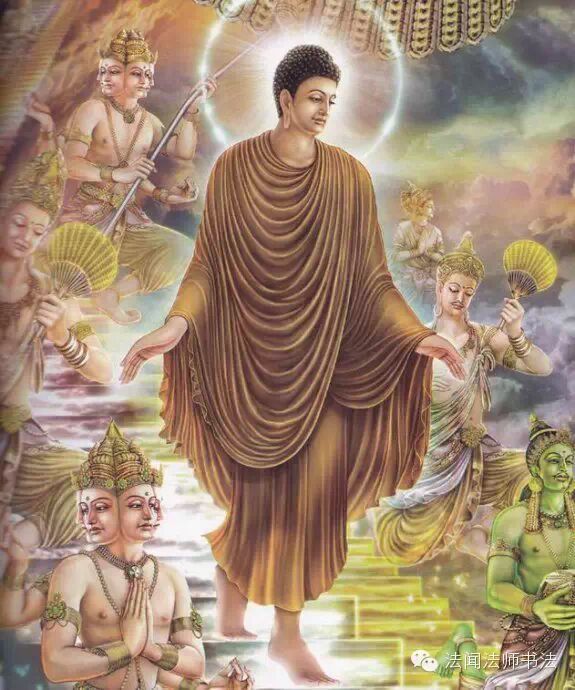 佛陀应天神的邀请,不动而上升天宫为了报答母亲之恩德而升天说法。