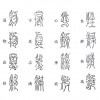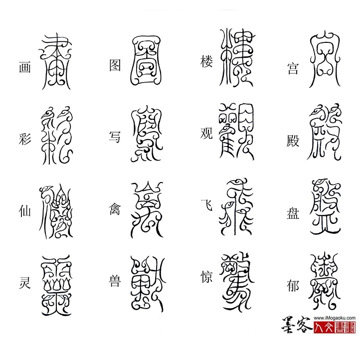 张彦中书法鸟虫篆《千字文》:宫殿盘郁,楼观飞惊。图写禽兽,画彩仙灵。